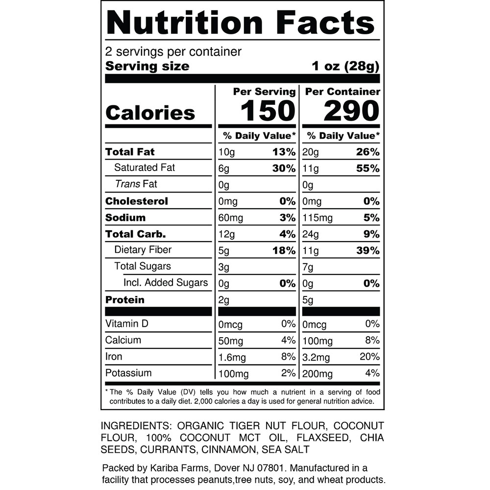 Organic tigernut flower, coconut flower, 100% coconut MCT Oil, flaxseed, chia seeds, currents, cinnamon, sea salt