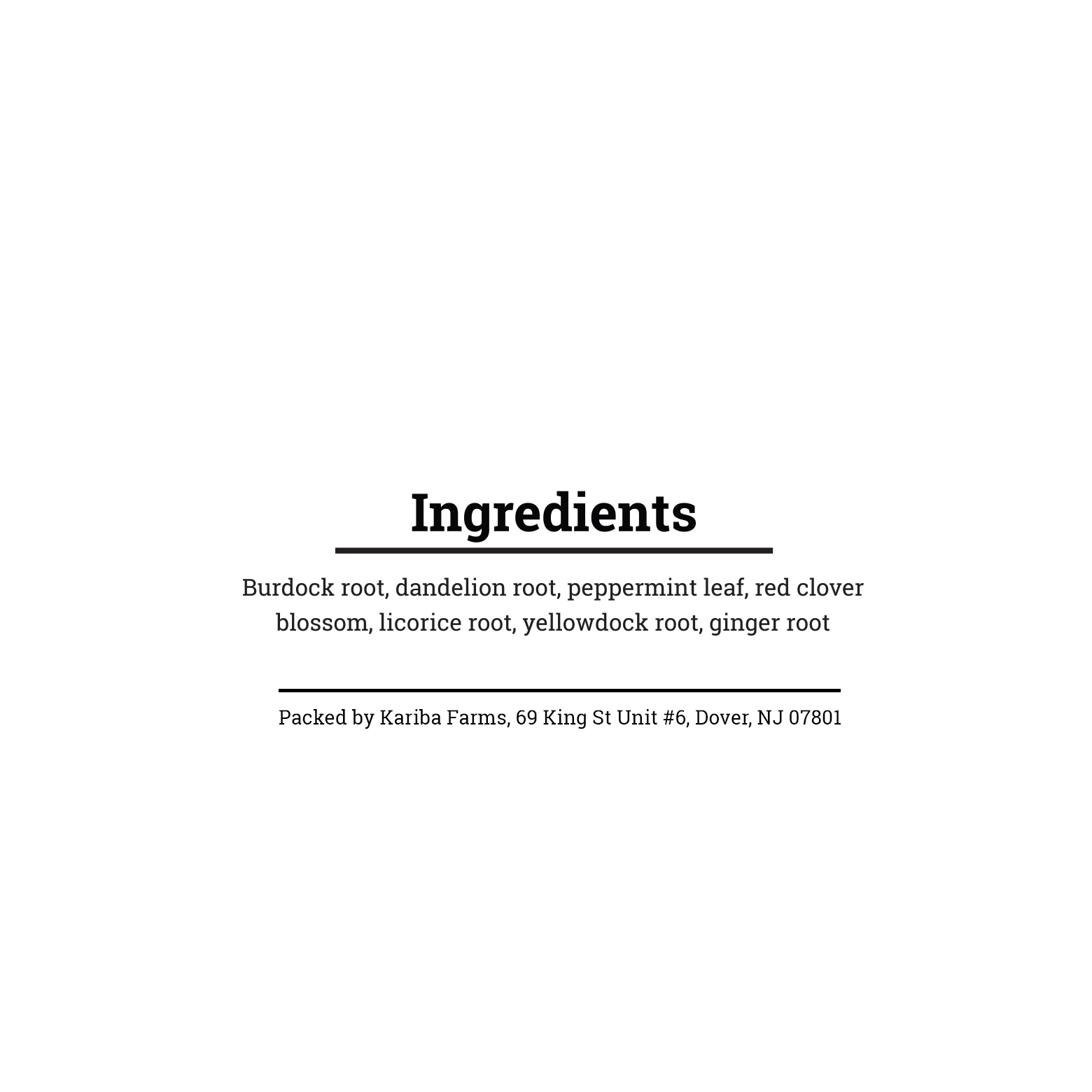 Burdock root, dandelion root, peppermint leaf, red clover blossom, licorice root, yellowdock root, ginger root.