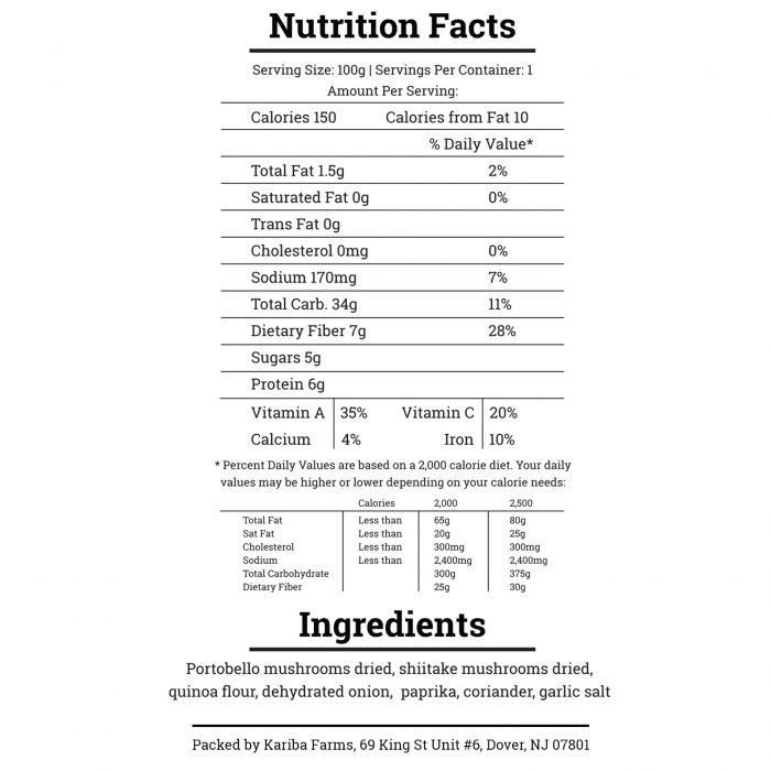 Portobello mushrooms dried, shiitake mushrooms dried, quinoa flour, dehydrated onion, paprika, coriander, garlic salt